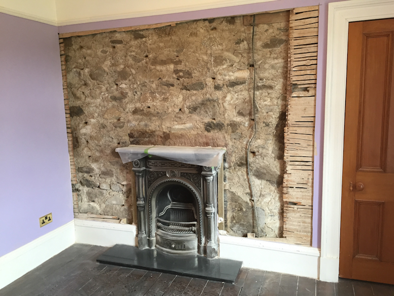 The pictures below show the affected areasĀ situated above the fireplace in 3 different rooms at a property near Rothienorman, Aberdeenshire. The top or mantle of fireplaces can also be prone to collecting debris (plaster, mortar and masonry) that has mounted upĀ over the years. In each case, the plaster, lath, framing and dooks were removed, the masonry brushed down and treated with a masonry biocide (for the prevention of fungal growth), reframed with treated timbers, and plasterboard sheeting fitted ready for a plaster coating.